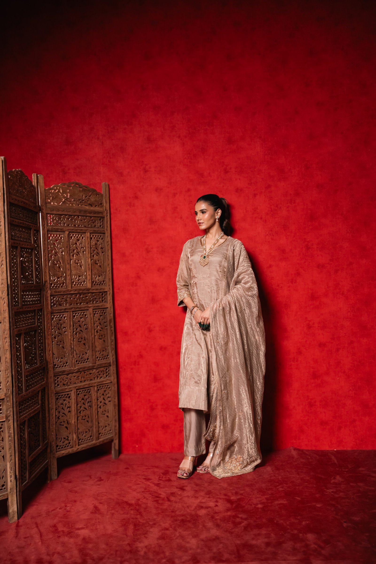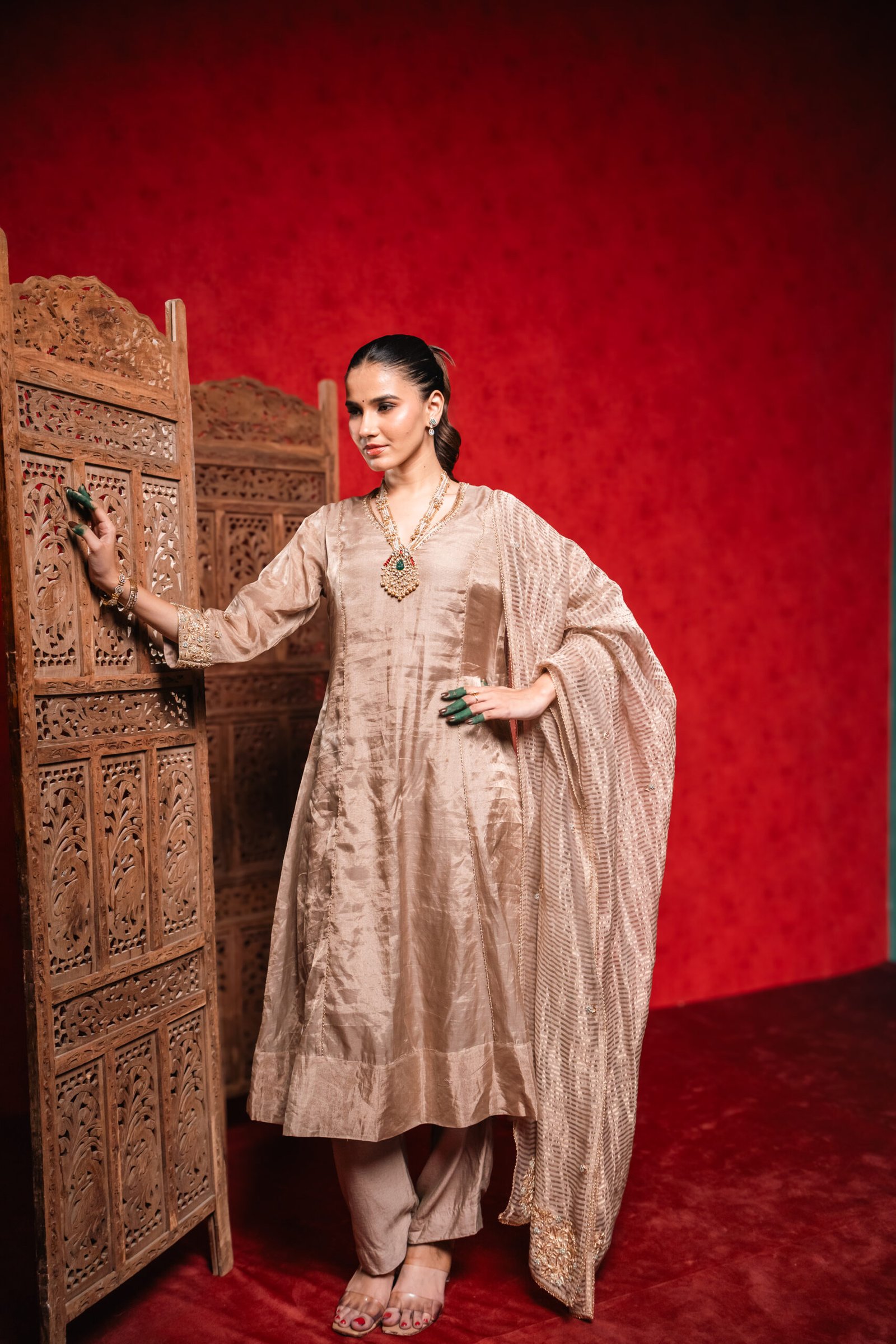 Each Copper Tissue Suit is hand-finished, so minor differences in texture or fall are part of its unique character. The Silk Saga ensures each piece feels luxurious yet wearable, balancing shine with comfort.