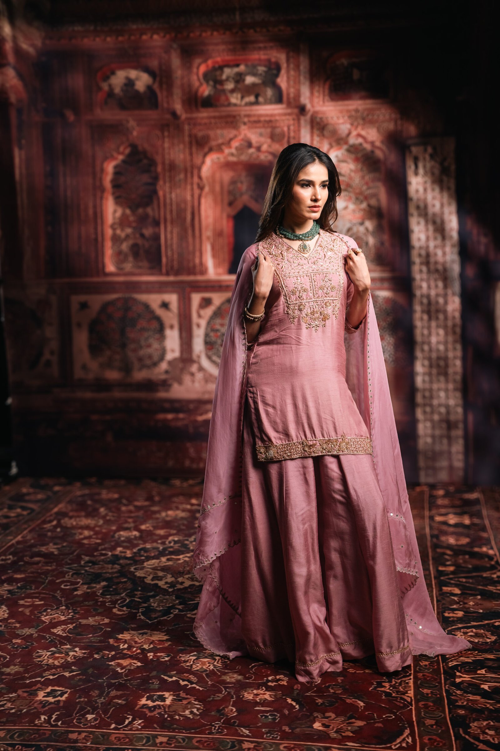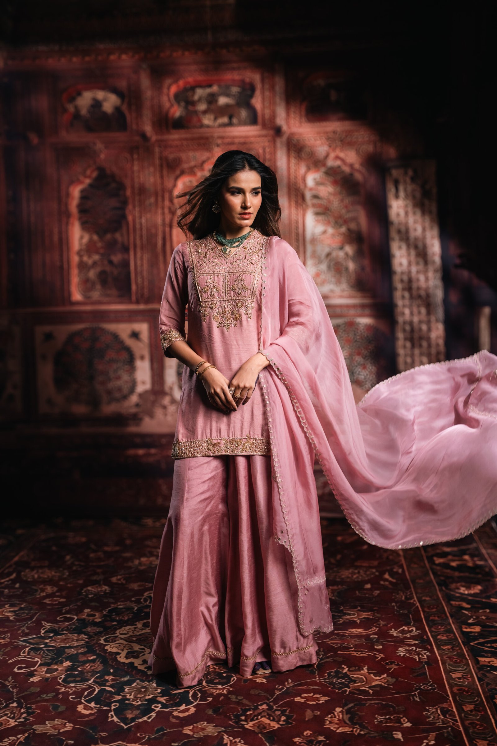 The deep crimson pink shade takes cues from traditional bridal and festive palettes, reinterpreted in a youthful, playful silhouette. Flowing sharara pants paired with a coordinated kurta and dupatta create a classic North Indian celebration look with a modern finish.