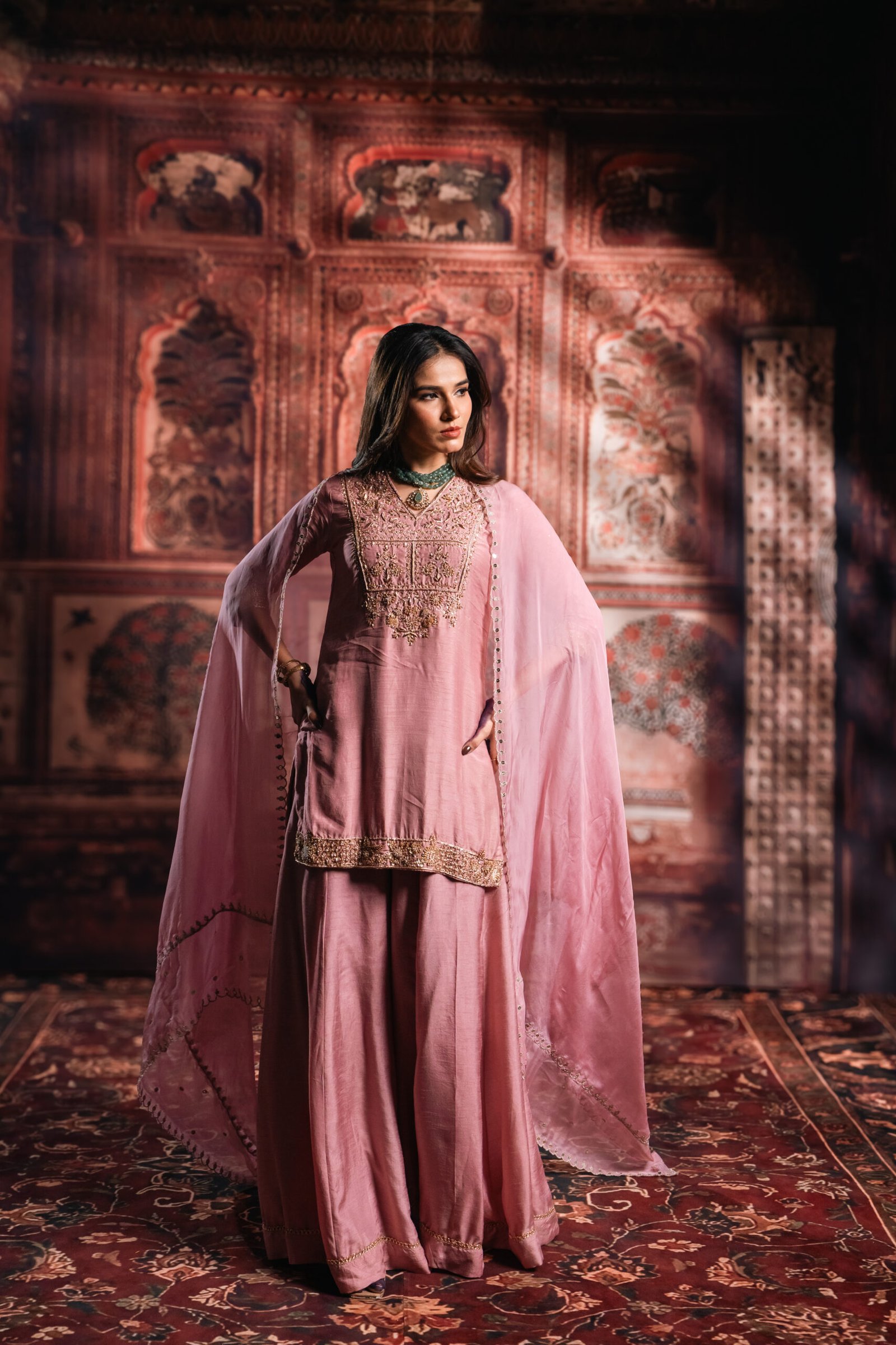 Crafted using luxe georgette/silk blend, the set features intricate embroidery embellishing the neckline, hem, and borders. Each panel of the sharara is carefully cut for volume and movement, while artisan handwork adds depth and richness to the overall look.