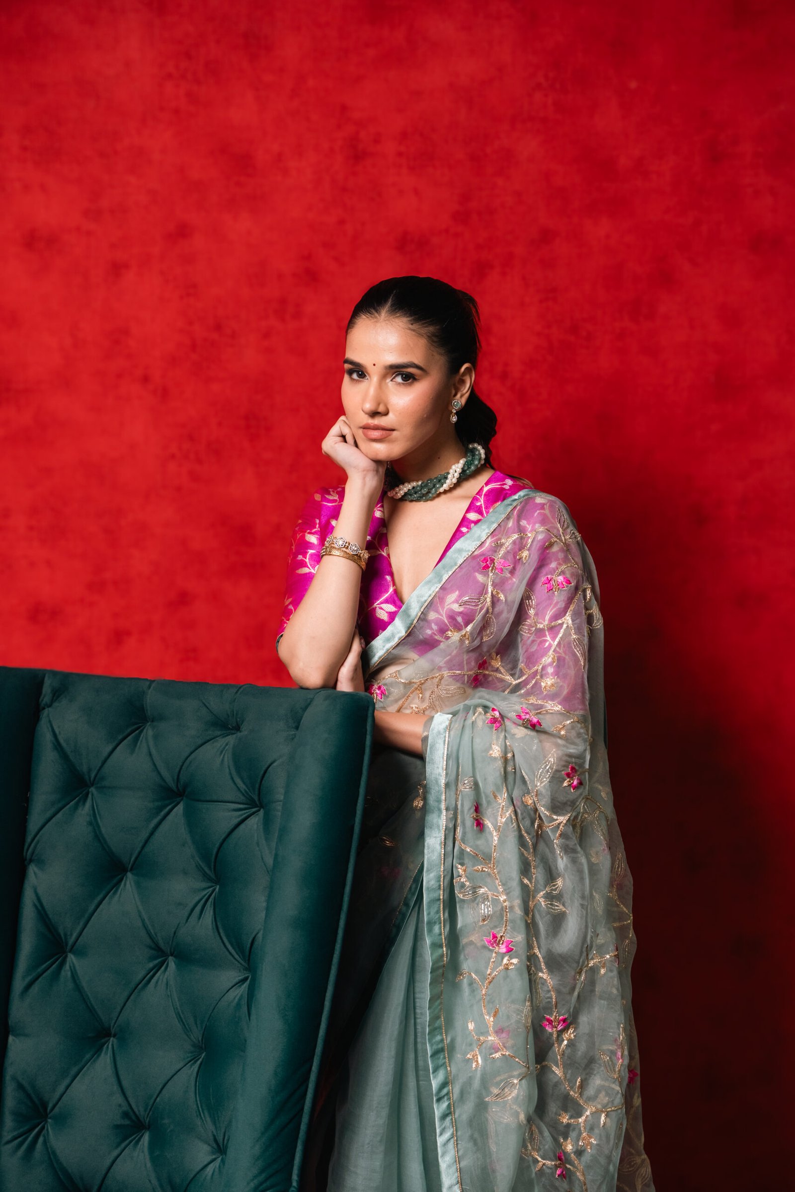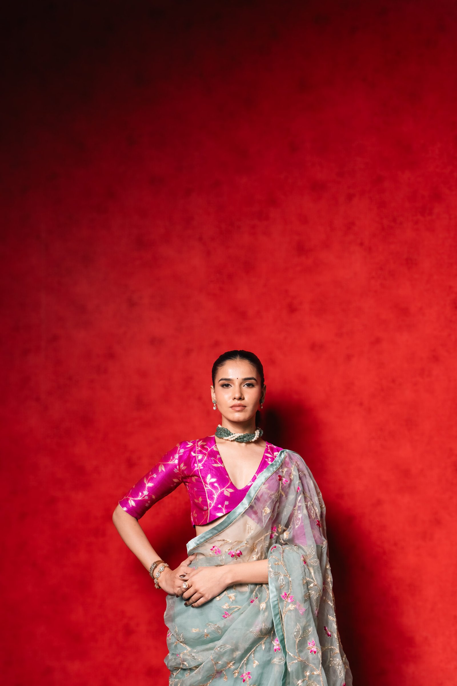 Crafted in premium organza, the saree is finished with intricate borders and subtle embroidery that add texture without overpowering the look. Each piece is carefully hand-finished by skilled artisans to ensure a graceful fall, neat finishing, and a luxurious hand-feel.