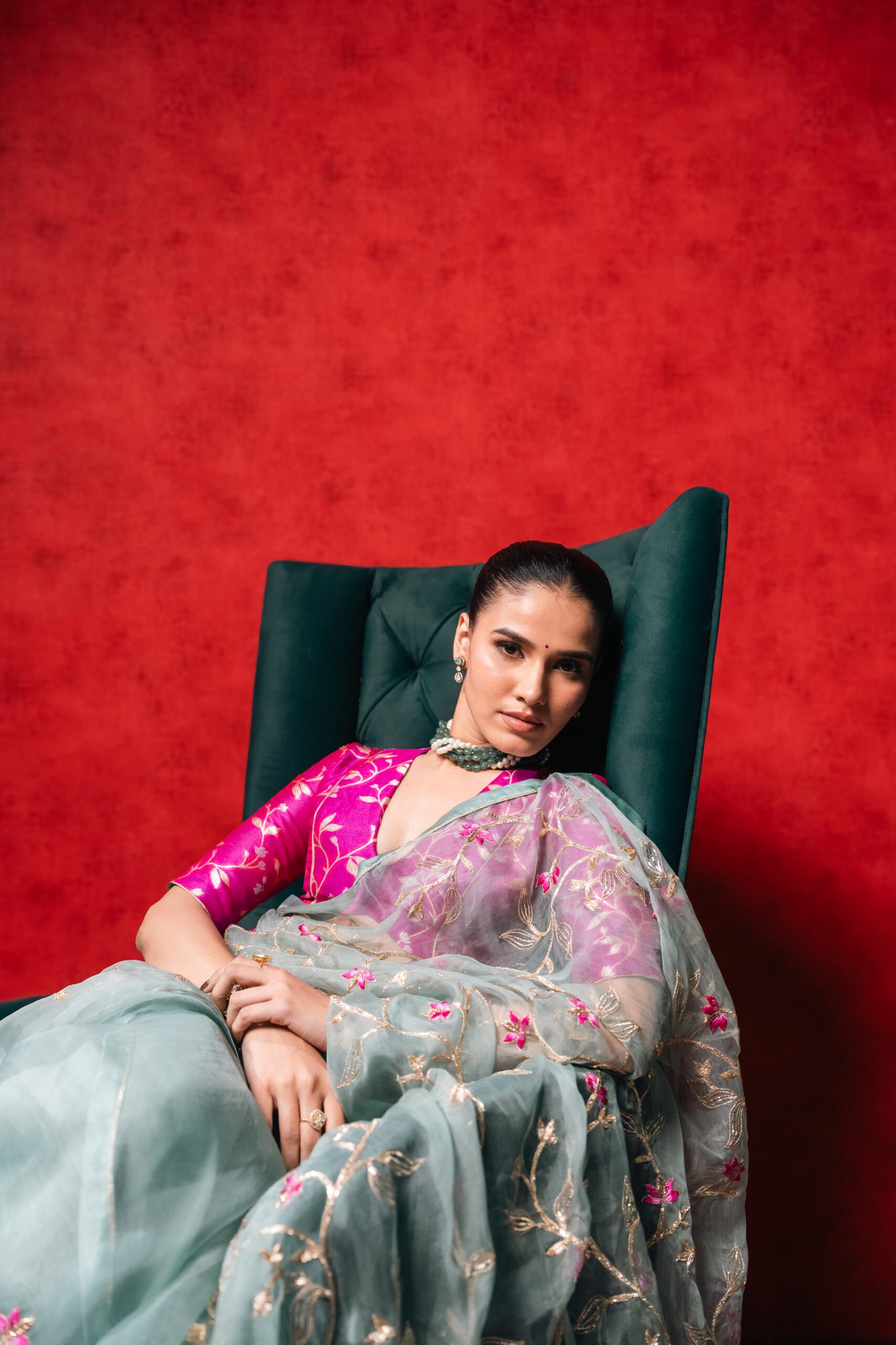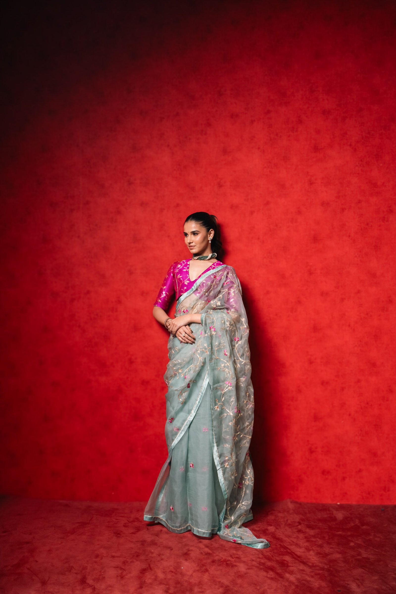 This saree reimagines classic festive dressing with a contemporary organza base that feels weightless yet regal. The sea green tone draws inspiration from serene lagoon waters, creating a calm, refined statement for both day and night events.
